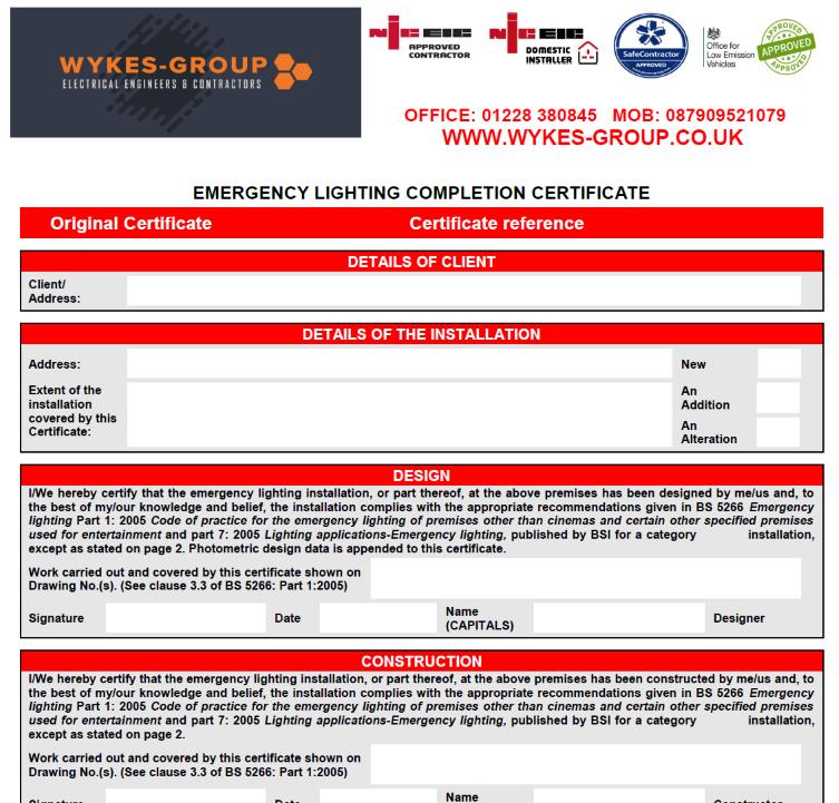At Wykes Group Ltd, we can perform a range of checks and tests on your emergency lights within the areas of Carlisle, Cumbria and south west Scotland, to make sure that they are working properly. This includes making sure that they have access to an emergency power source in the event of a power outage. Once the tests have been completed we can provide you with an Emergency Lighting Certificate. These tests should be completed every three years, but as a business owner you should be testing the emergency lights once a week and logging it for the electrician to check over once the next test is due.